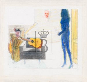 Lyrical composition. Woman in blue on the right pointing a knife. Man kneeling down with his guitar against an armchair. In the background, an orange bust hangs on the wall.